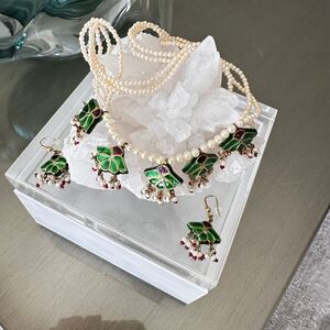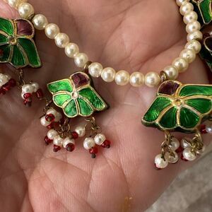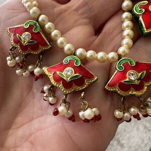 This exquisite vintage necklace set showcases the timeless elegance of Kundan-inspired craftsmanship. Featuring a double-strand of delicate pearls, the necklace is adorned with five hand-painted floral motifs—each set on a reversible pendant that allows you to choose between a vibrant red design and a fresh green one, accented with gold-tone detailing and tiny hanging pearls.