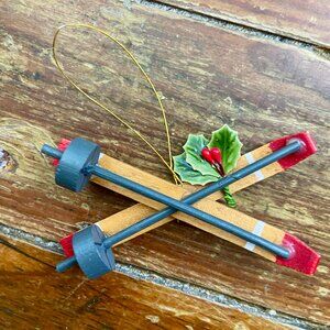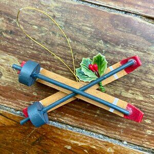 A vintage Kurt Adler hanging wood Christmas ornament of crossed snow skis with poles and holly. Made in Taiwan.