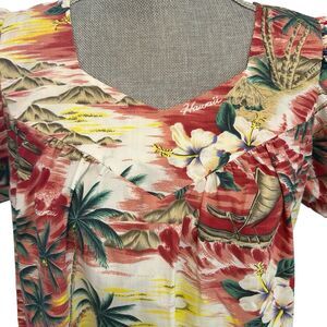 Vintage Ky's Hawaiian Muumuu Dress Women's Size M Red Yellow Petal Sleeves. Good pre-owned condition with normal vintage wear, see photos for details. Measurements in photos and are approximate. The dress measures about 42" long from shoulder to hem. Dress does have a slight vintage smell.