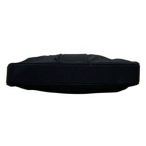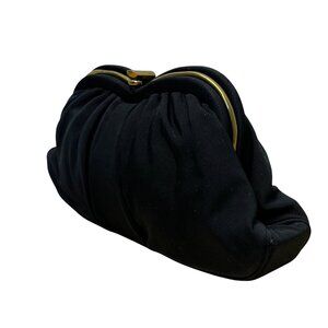 This vintage black evening clutch features an elegant gold-toned clasp and frame, complementing its pleated satin exterior. Includes an interior pouch with comb and mirror.