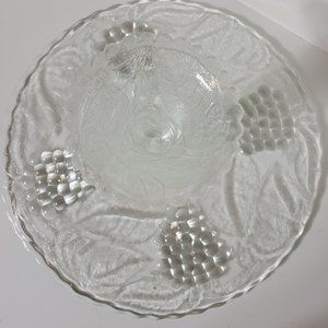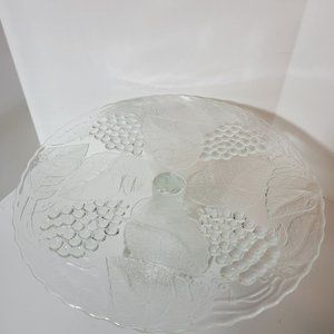 L. E. Smith Clear Glass with Grape Design Pedestal Cake Plate. There is no manufacturing information on it. No chips or cracks. Photos are a part of the condition.