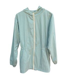 This vintage L.L. Bean windbreaker in junior's women's size XL is a retro piece perfect for casual occasions. Made of nylon and polyester with a softshell fabric type, it features a zip closure, hood, and pockets. The jacket is lightweight and has a mid-length design with long sleeves, making it ideal for outdoor activities. The green and yellow check pattern adds a touch of 80s style, while the USA outdoor theme makes it a unique addition to any wardrobe. Made in the United States, this windbreaker is a classic choice for those looking for a stylish and functional outerwear option.