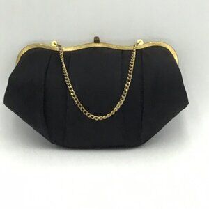 3/$18 Vintage formal purse with an attached coin purse. The brand is L & M After Five, USA. It is black with gold trim and dark gold/bronze interior and the coin purse is attached with the original gold cord. Clean inside and out. It measures approximately 6 inches by 8.5 inches. Good condition.