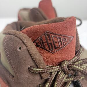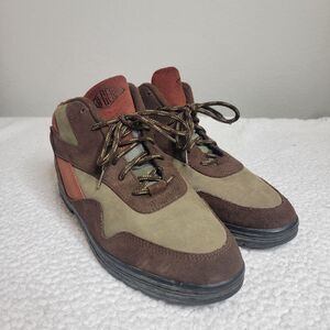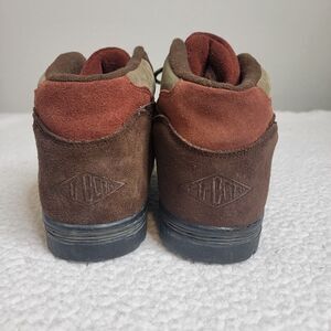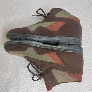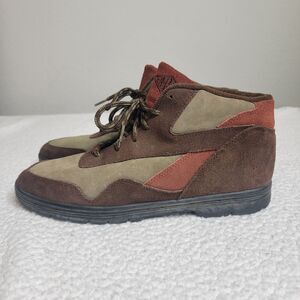 Step back in time with these vintage LA Gear high top sneakers from 1992. These brown suede shoes feature a unique colorblock pattern, almond toe shape, and lace-up closure for a comfortable fit. The flat heel makes them perfect for casual wear, and the high top shoe shaft style adds extra support. These shoes are a women's size 9 and have a standard shoe width, with a UK size of 7 and EU size of 40.5. The LA Gear brand is known for their quality and style, and these sneakers are no exception. Add them to your collection today and step out in style.