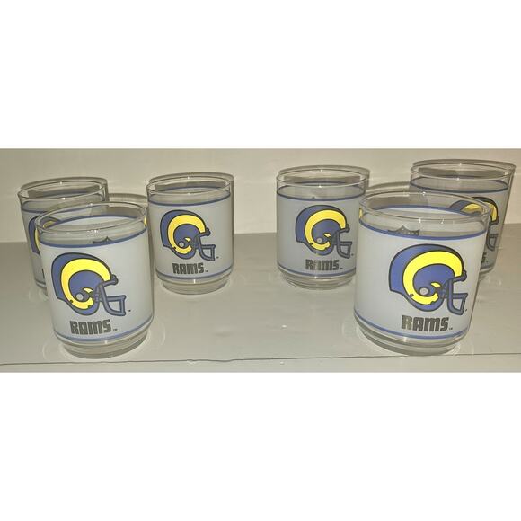 This product is a set of 6 vintage Los Angeles Rams frosted glass tumblers from the 1980s, featuring the Mobil Gas brand logo. Officially licensed by the National Football League (NFL), these 4" tumblers are perfect for football fans looking to show their support for the team in a unique and stylish way. Made in the United States, these tumblers are a great addition to any sports memorabilia collection and are suitable for both male and female adult fans of the Los Angeles Rams. No cracks or chips. Nice Pre Owned Condition as pictured