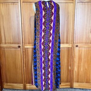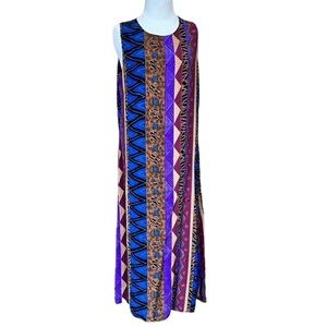 This vintage possibly from the 1990s sleeveless maxi dress boasts a captivating vertical Aztec/African vibrant print, adding a unique flair to its design.