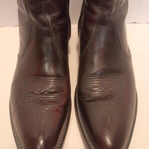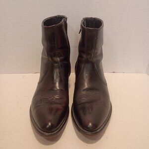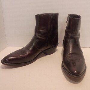 From on of America's favorite boot makers, LAREDO, these vintage black short Western style boots are made of smooth, shiny black leather with pointy toes and stacked 2" heel. The inside zip makes them easy on and off. Perfect vibe for dressy retro or Rockabilly! In excellent condition with a little cracking of the inside lining. Otherwise very little wear--leather great with no damage, soles have minimal wear and no heel/toe drag.