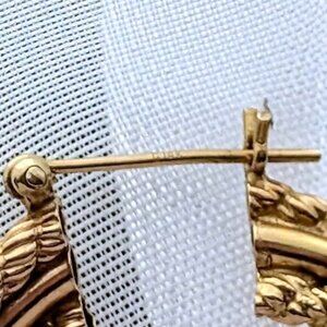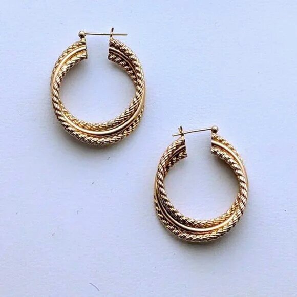 Beautiful Vintage LARGE solid 14K Yellow Hollow Gold Twisted Rope Triple Circle Design Hoop Pierced Earrings about 9.8 grams (marked "14K" and acid tested). They are in great vintage used pre-owned condition. Measure about 1 1/2" in length by about 1 1/4" in diameter and about 8mm in their thickest part.