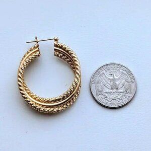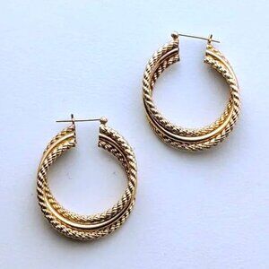 Vintage LARGE 14K Yellow Gold Twisted Rope Triple Circle Hoop Pierced Earrings