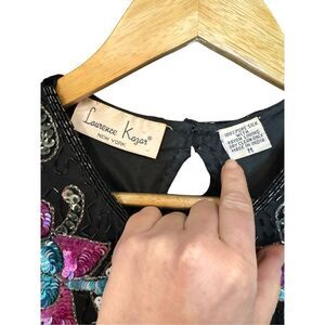 This gorgeous vintage dress by Lawrence Kazar features dazzling peacock-colored sequins and intricate beaded details that make it a true showstopper.