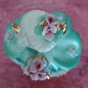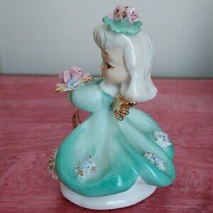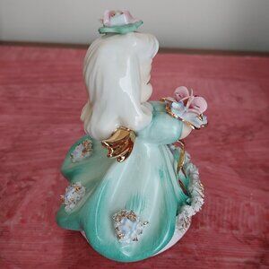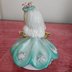 Angel has long white hair with a green hat w/ pink flowers and porcelain white delicate face/rosy cheeks