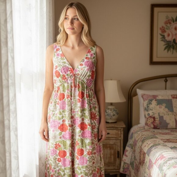 Vintage L’Amour Floral Maxi Dress lingerie daywear Pink Green Cottagecore Canada