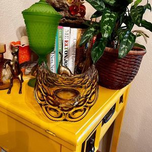 Here we have today is a lovely amber Moon & Stars banana, fruit bowl. This lovely piece is 5 3/4" tall, 12 1/4" long and 6 1/2" wide. Bowl is in great condition with no chips or cracks.