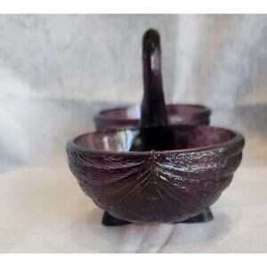 Vintage L.E. Smith Amethyst Glass Double Dish with Loop Handle, Leaf Base, 8" T