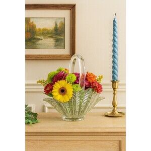 This beautiful LE Smith feather basket is an iconic mid-century pressed glass design. Its unique feather pattern and arched handle make it ideal as a centerpiece, candy dish, or decorative display for your vintage-inspired home.