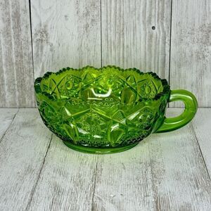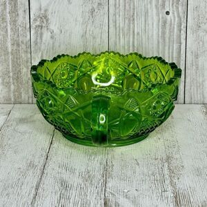 Vintage L.E. Smith Heritage Quintec Green Depression Glass Bowl with Finger Handle