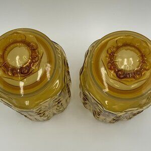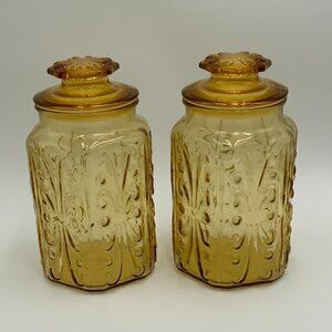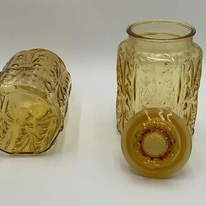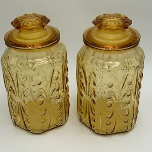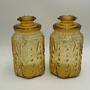 Add charm to your kitchen with this vintage L.E. Smith Honey Amber Canister Set. The set includes two large cylinder-shaped jars with Atterbury Scroll pattern. Made of high-quality glass, these jars are durable and sturdy enough to keep your kitchen staples safe. The honey amber color of the jars adds a touch of elegance and warmth to your decor. Measuring 9 1/2 inches high and 5 inches wide. Whether you are a collector or looking to add style to your kitchen, this original vintage set is a perfect fit for your needs.