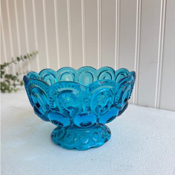 - Vintage L.E. Smith pedestal candy dish in vibrant colonial blue glass.