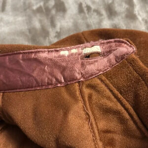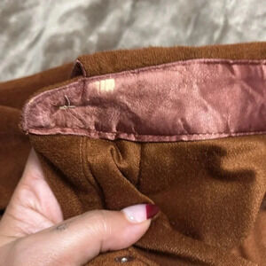 Super fun retro button up in a brown/bronze/burnt orange sort of color. This is preloved and shows wear around the collar, it’s not noticeable when you’re wearing it. The label is faded out so the care label can not be read nor can you see the fabric material. But it feels like velour. The collar lining feels silky so it may be polyester. This would make a super cute shacket!
