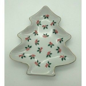 Vintage LEFTON CHINA Hand Painted Holly Berry CHRISTMAS TREE Candy Dish #2387