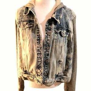 Lei throwback true Y2K acid washed blends Stone wash the best of both worlds aesthetic gray sweater material for hoodie and sleeves the denim is a button fly type button up the front it has pockets collared The complete collector edition 80s 90s punk rock skater streetwear rock band grunge and obvious vintage old distressed style condition is good but does have where as to be expected and some discolorations stain on wrist see photos for extra description not in perfect condition