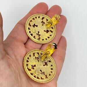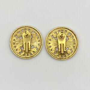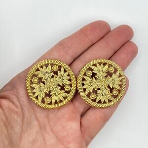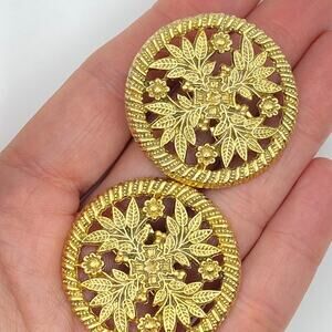 Vintage LES BERNARD Floral Gold Tone Medallion Round Earrings Clip On Like New