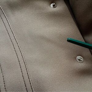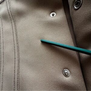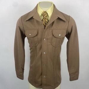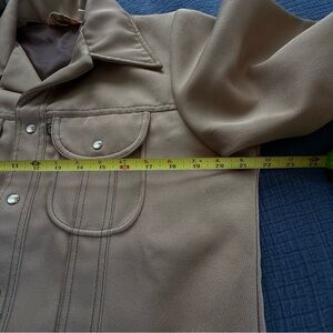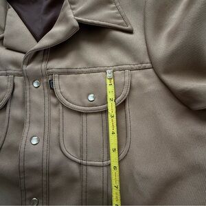 Stylish Levi's shirt jacket in a versatile light brown. Features pearl buttoned pockets. Ideal for layering. Polyester retro shirt/jacket for the cool person that just feels like disco is in their blood!!! You will be stylish and noticed!!