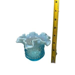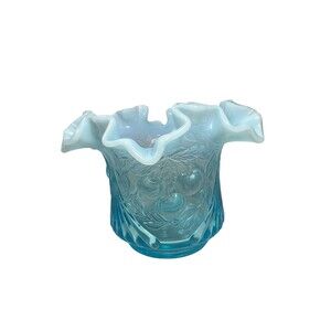 This vintage vase is a stunning addition to any collection. Made by L.G. Wright in the 1960s, it features a beautiful opalescent blue glass with a raised cherry design. The vase is a perfect example of mid-century modern design and is sure to be a conversation starter.
