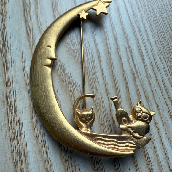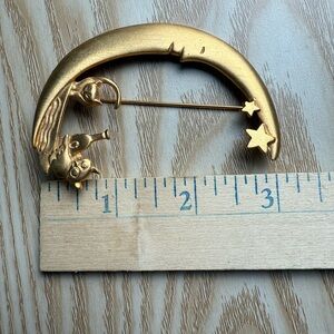 Beautiful vintage LIA gold-tone brooch featuring the classic "Owl and the Pussycat" motif. The design shows a sweet owl playing a horn and a cat sitting together on a crescent moon beneath two floating stars. Matte brushed gold finish with lovely sculptural detail.