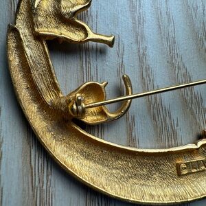 Vintage LIA Owl & Cat on Moon Brooch Gold Tone Crescent Pin 3"