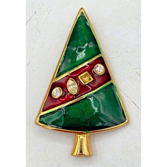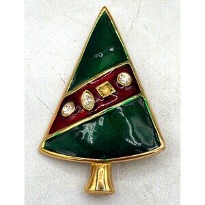 Adorn your ensemble with a touch of festive elegance with this vintage LIA signed brooch. Featuring a charming Christmas tree design, it's meticulously crafted in enamel and rhinestone, showcasing a vibrant palette of green and red stones. The round crystals catch the light, adding a sparkling contrast to the gold-tone finish. A fine addition to any jewelry collection, this brooch is perfect for the holiday season or any occasion that calls for a bit of seasonal cheer. It's an original piece, designed and manufactured in the United States, and the signature confirms its authenticity. This piece is not only a beautiful accessory but also a testament to the craftsmanship of LIA's artisans.