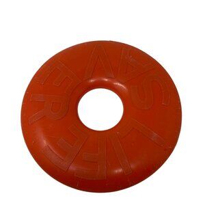 This vintage red "LifesaverS" frisbee sparks joy with its playful design and embossed lettering. A charming relic, blending nostalgia with carefree outdoor memories.