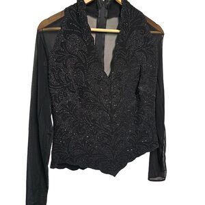 Vintage LILLIE RUBIN Beaded Blouse V Neck Mesh Long Sleeve Corset Top LARGE