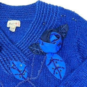 Add a bold statement to your wardrobe with this vintage Lim's cobalt blue sweater. Featuring a luxurious angora blend. beautifully adorned with 3D floral appliqués, intricate beading, & sequins. classic but unique look, perfect for vintage lovers or anyone looking to stand out. Vintage enthusiasts will adore this rare and vibrant piece!