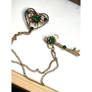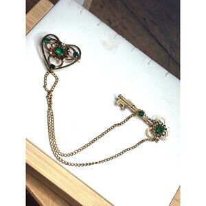 Vintage LINC 1/20 12KGF 1Heart & Key Brooch With Green Gemstones