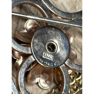 This enchanting brooch set features a heart and key design, adorned with vibrant green gemstones. Made by LINC, this vintage piece showcases intricate craftsmanship with a golden chain connecting the two. Ideal for collectors or as a statement accessory, it embodies the charm of bygone eras.