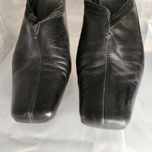 The product is a pair of vintage Liz Clairborne Margarete black boot flex slides in size 6.5. These original 1990s leather shoes are designed for casual occasions and feature a stylish boot slide style. The classic black color adds versatility to the wardrobe, making them a timeless and functional addition for any fashion-forward individual. No box. Used Vintage with wear on the soles and the edge of the upper material.