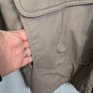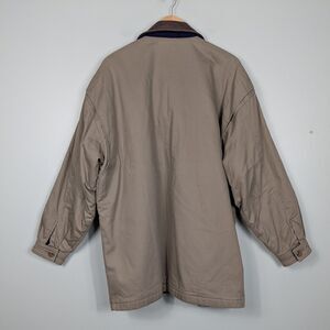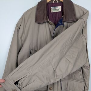 Vintage barn jacket / chore field jacket with leather collar from LL Bean, size L. Tan/khaki brown cotton with darker brown leather collar. Button up over zipper. Wool blend navy blue in part of lining. Ideal for 90s, 80s, classic, timeless, heritage, American, rustic, classic, dad, hunting, barn, farmer, and outdoor vibes. Perfect for fall, winter, layering, workwear, and ranch. Heavyweight (2lbs 13oz). Lots of pockets.