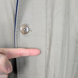 • Small mark near buttons, edge wear on leather collar, and marker on brand tag (see photos,) otherwise in good overall condition.