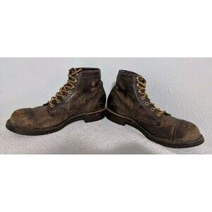 These boots are in very used condition. There are marks all over the leather. There is a minor spot of white paint on the front right shoe. One of the laces is a little worn. One of the soles shows some wear. The bottoms are also slightly dirty. All of this information is shown in the above pictures. Otherwise, in good condition. Comes from a smoke-free home.