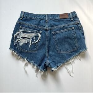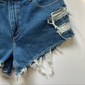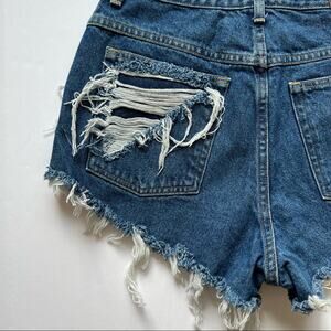 Custom distressed jean shorts cut off from a pair of vintage L.L. Bean 100% cotton jeans. Heavy distressing on the front & back and distressed hems.