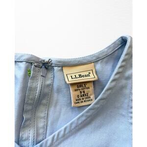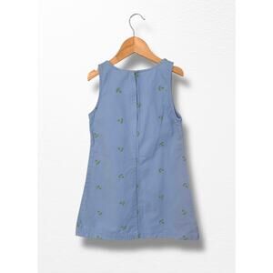 Sky blue vintage dress from LL Bean in girls’ size 5/6. Sleeveless, features a green embroidered anchors pattern, zip up back with hook and loop closure, and a faux crossover front. 100% cotton. In great overall condition, there is a small spot of fading on the front from where stain cleaner was used, but it’s barely perceptible. See last pic for close up.