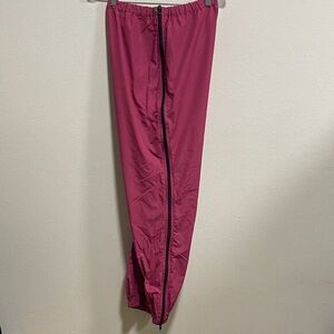 Rare vintage full side zip windbreaker pants in a bold magenta hue. Made in the USA with a lightweight, packable nylon shell — ideal for hiking, layering, or Y2K streetwear vibes. Full-length zippers on both legs allow for easy ventilation or removal.