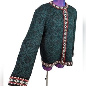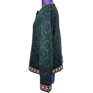 Features heavyweight dark green tight knit cotton fabric in dark green black and red, Keltic Nordic style, button front cardigan, silver Keltic embossed buttons, contrasting Scottish print hems, black Nordic snowflake print, high round neckline, long loose fitting casual sleeve, cozy ski lodge style, tapestry vibes, grandmacore, Nordic style.