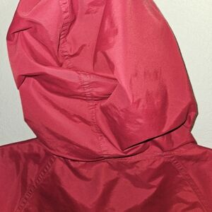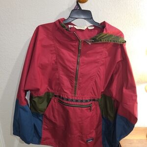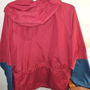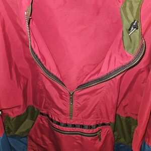 Stylish red pullover jacket with green and blue accents. Features a front zipper and pocket.