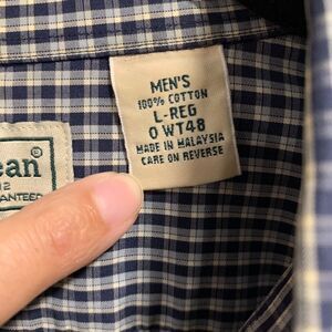 This is a vintage LL Bean men's button-up shirt in size L with a multicolor plaid pattern. It features a collared neckline with a spread collar, long sleeves, and button accents. Made of cotton knit fabric, this classic shirt is suitable for travel, parties, workwear, and casual occasions. The design is inspired by outdoor and retro themes, perfect for a classic 80s or 90s look.