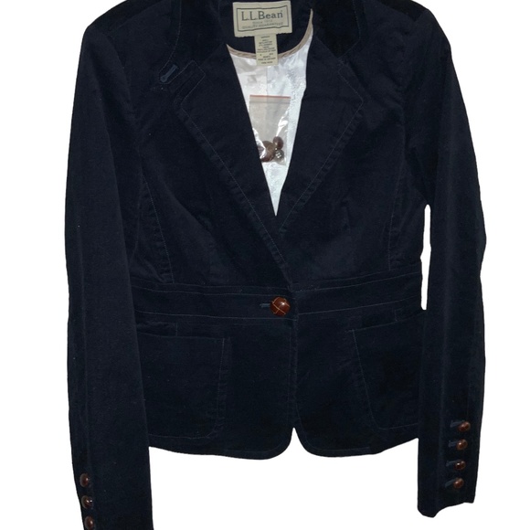 This listing is for a Vintage LL Bean Navy Blue Velvet Wooden Buttons Lined Blazer; Size 6 Reg. The blazer is new without tags and free of stains, rips or tears.The approximate measurements: sleeve length 24.5”, length 23” and 35”.