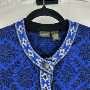 Vintage LL Bean Womens M Cardigan Sweater Wool Blue White Nordic Scandinavian