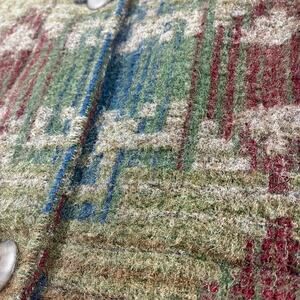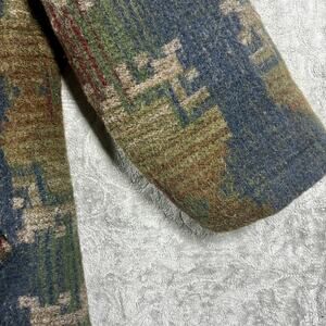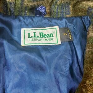 Women's vintage LL Bean wool blend coat, size XL. Native American inspired print, brown red and blue colors. Insulated for warmth, cinch waist. Good condition with no stains or holes, though coat has some strings coming off it and has a very faint vintage / stored in my aunt's basement smell. Made in USA, from the 1990s. Button and zipper front. 84 percent wool with acetate satin lining.