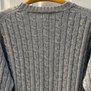 More silver than gray. Fantastic cable knit. 80% wool, 20% nylon. Ribbed collar, sleeve cuffs, waist.